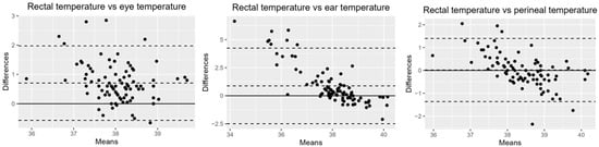 p < 0.0001). Statistically, no significant difference was found between rectal and perineal temperatures, and similarly, no significant difference was observed in body temperatures between age groups. Bland–Altman analysis revealed that the perineum had the smallest bias relative to rectal temperature: 0.02 (95% Confidence Interval [CI]: −0.12, 0.16; Limit of Agreement [LOA]: −1.36, 1.40). This was followed by the eye: 0.71 (95% CI: −0.57, 0.84; LOA: −0.57,1.98). The bias for the inner ear pinna was notably higher: 0.88 (95% CI: 0.53, 1.23; LOA: −2.49, 4.25) (