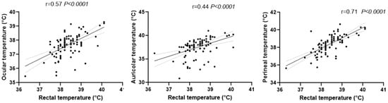 16]. While rectal temperature is considered the standard measurement to assess body temperature in conscious animals, it can be stressful to perform. Our study aimed to assess how well infrared temperatures from the ocular, inner ear pinna, and perineal regions correlate with and agree with rectal temperature in cats. We found that infrared temperatures at the ocular and inner ear pinna sites were significantly lower than rectal temperatures, a finding consistent with prior research comparing rectal and non-contact infrared measurements at various body locations in cats [
