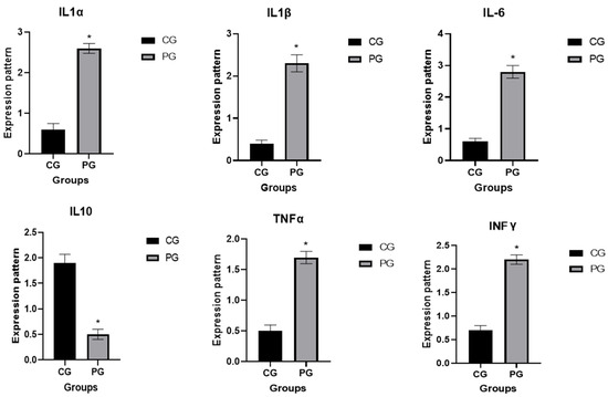 | IL1α (pg/mL) | 32.6 ± 2.7 | 155.1 ± 3.9 * | 0.002 |