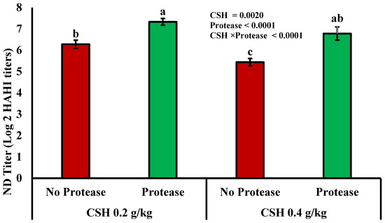 Effects of dietary treatments on the HAHI antibody titers against Newcastle disease (NDV) in broiler chickens at day 35; CSH 0.2 g/kg = cysteamine hydrochloride at 0.2 g/kg; CSH 0.4 g/kg = cysteamine hydrochloride in the diet at 0.4 g/kg; protease was added to the diet at 0.2 g/kg. Superscripts on different bars indicate statistical significance at p ≤ 0.05.