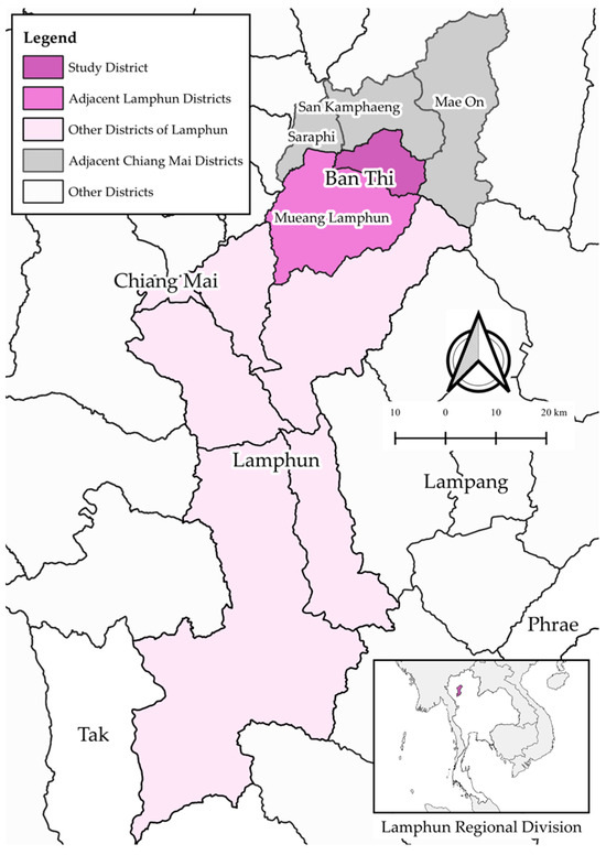 Map of the study area, Ban Thi District, Lamphun Province, Thailand. The map illustrates the geographical location of Ban Thi (study district) relative to surrounding districts in Lamphun Province (Mueang Lamphun, other districts of Lamphun) and key adjacent districts in Chiang Mai Province (San Kamphaeng, Mae On, Saraphi). It also indicates the broader regional context within Thailand (inset map). The map was generated using QGIS.