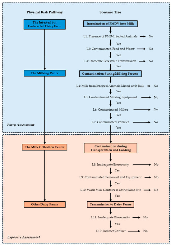 Physical risk pathway and scenario tree for the introduction and transmission of foot-and-mouth disease virus (FMDV) to dairy farms via raw milk transportation in Ban Thi District, Lamphun Province, Thailand. The diagram illustrates the sequential events of FMDV entry and exposure, categorized into entry assessment (from an infected farm to the milk collection center) and exposure assessment (from the milk collection center to another dairy farm). The scenario tree details specific likelihoods (L1–L12) at each critical juncture of the pathway.