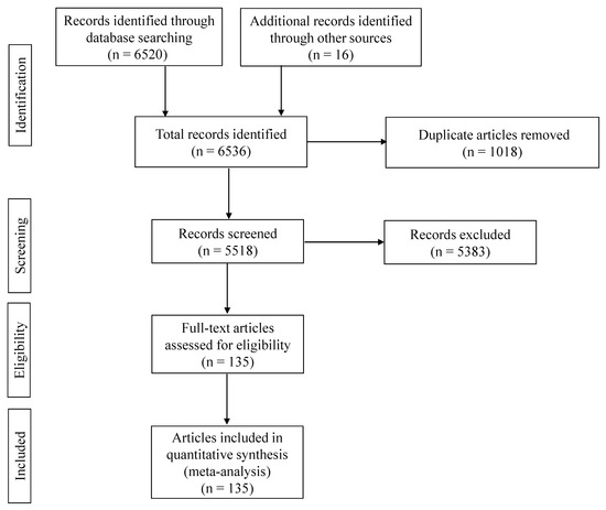 The PRISMA flow diagram [40] of the systematic review from initial search and screening before final selection of publications to be included in the meta-analysis. After initial identification of the records that appeared in each search engine with certain keywords, the titles of the articles were compared across the search engines to remove duplicates. Records were subsequently screened, and articles related to the hypothesis were assessed based on the eligibility criteria; ultimately, one hundred and thirty-five articles were included in the meta-analysis.
