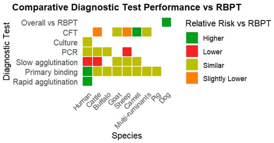 The heatmap depicts the RR of various diagnostic tests compared to RBPT for diagnosing brucellosis across multiple host species.