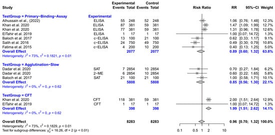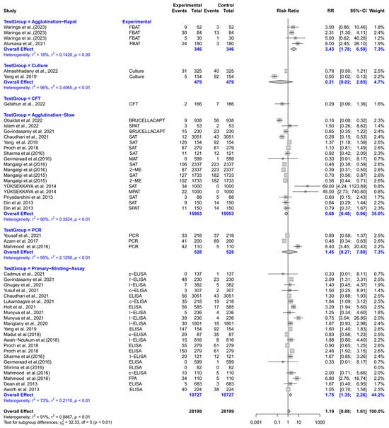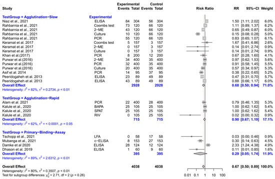 The forest plot represents the RR of various tests compared with five different tests (Supplementary Figure S7). The subgroup analyses revealed that the RR did not differ significantly when experimental tests were compared with the control. The control groups included rapid agglutination tests, slow agglutination tests, primary binding assays, staining, and culture.