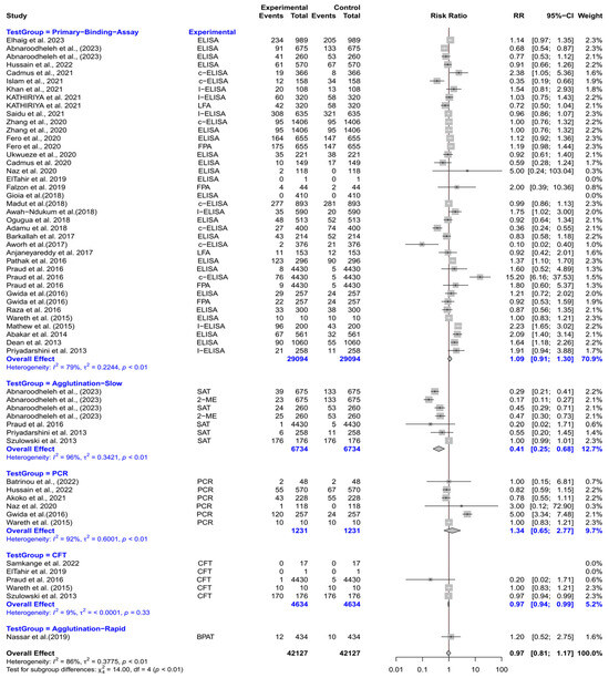 The forest plot represents the RR of various tests compared to three different test groups (Supplementary Figure S5). The subgroup analyses revealed that the RR did not differ significantly when experimental tests were compared with the control. The control groups included rapid agglutination tests, slow agglutination tests, and primary binding assays.