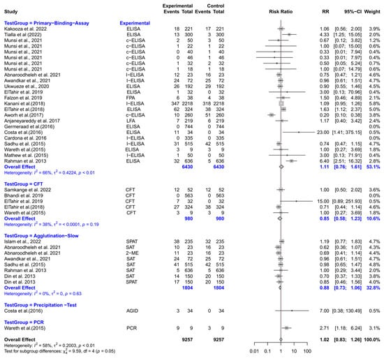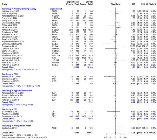 The forest plot represents the RR of various diagnostic tests compared with five different diagnostic test groups (Supplementary Figure S12). The subgroup analyses revealed that the RR did not differ significantly when experimental tests were compared with the control. The control groups consisted of rapid agglutination tests, primary binding assays, precipitation tests, staining, and culture.