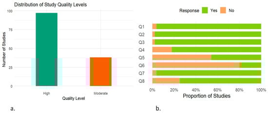 The bar chart illustrates the distribution of study quality based on the JBI critical appraisal checklist (Figure 9a). Out of 135 included studies, 97 (72%) were classified as high-quality, while the remaining 38 (28%) were rated as moderate-quality. The assessment did not identify any studies as being of low quality. The stacked bar plot summarizing responses to the eight JBI checklist questions revealed that the highest proportion of “Yes” responses was observed for Q3: “Was the exposure measured in a valid and reliable way?”. In contrast, the lowest proportion of positive responses was recorded for Q6: “Were strategies to deal with confounding factors stated?” (Figure 9b).