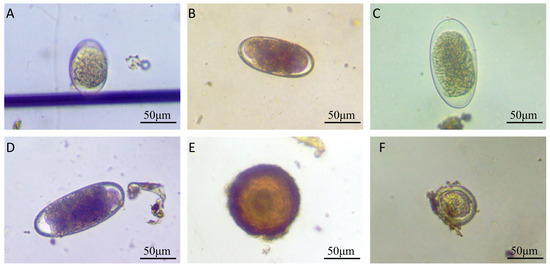 Morphological characteristics of gastrointestinal parasite eggs or oocysts in horse feces. (A) Strongyle egg (88 μm × 56 μm); (B) strongyle egg (109 μm × 50 μm); (C) Triodontophorus-like egg (124 μm × 62 μm); (D) Triodontophorus-like egg (132 μm × 56 μm); (E) Parascaris equorum egg (112 μm × 109 μm); (F) Eimeria spp. oocyst (62 μm × 59 μm).