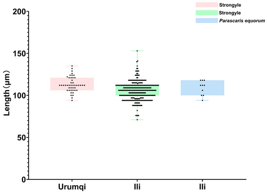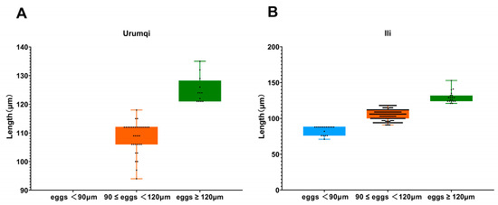 Length measurements of strongyles eggs across different areas. (A) Egg length distribution of strongyles in Urumqi; (B) egg length distribution of strongyles in Ili.
