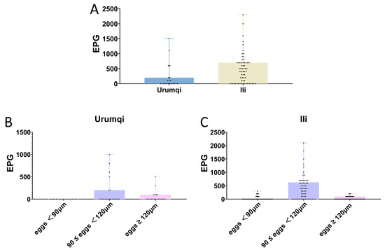 Regional variations in parasite infection intensity. (A) Comparative analysis of parasite infection intensity between Urumqi and Ili. (B) Strongyle infection intensity in Urumqi. (C) Strongyle infection intensity in Ili.