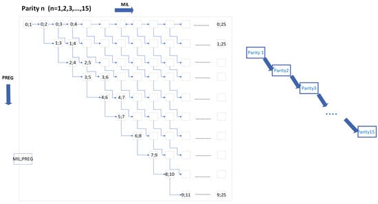 An MDP is a particular stochastic optimization model that describes a system by states and actions that affect the transitions between these states in a probabilistic way [18]. Each action has a reward associated with it, and the goal is to find an optimal policy that maximizes the reward accrued over time. Key components include states, actions, transitions, rewards, and the optimal replacement policy, enabling informed decisions and optimizing long-term efficiency. An MDP for a herd of dairy cows without interaction between animals is proposed. The model is an adaptation for dairy cows of the models presented by Plà-Aragonés [19,20]. The transition times of the model are monthly, and the state variables considered are the month of lactation (MIL), month of pregnancy (PREG), and number of parity (PAR). Months in lactation can take values from 1 ≤ MIL ≤ 12, so that the maximum number of months a cow is milked is fixed at 12 months. Parity covers the range of 0 ≤ PREG ≤ 9, being PREG = 0 when the cow is not pregnant, and PREG ≥ 0 when it is the i-month of gestation. When PREG = 9, calving occurs. The maximum parity considered is PAR = 15, and then parity can take values from 1 ≤ PAR ≤ 15, with the cow starting in the model at PAR = 1 and being replaced whenever PAR = 15 is completed. At the beginning of the process, all cows are in the state MIL = 1, PREG = 0, and PAR = 1. At each monthly time step, the state of each cow updates its values of MIL, PREG, and PAR according to the actual state of the cow and feasible transition probabilities like pregnancy, abortion, death, and involuntary culling. These probabilities depend on MIL and whether the cows are primiparous or multiparous. The monthly transitions of the model can be represented by a directed graph as shown in Figure 1, where feasible transitions from one state to the next one (1, PREG, MIL) are represented by direct arcs of each month in milk and pregnancy at the first parity, and when a cow goes to parity 2, it repeats the same structure. A cow is inseminated when it is not pregnant (PREG = 0). It is after one month, depending on the failure or success in conception, that the cow can remain non-pregnant (PREG = 0) or move to the first month of pregnancy (PREG = 1). The conception or pregnancy rate is generated through a binomial distribution. A milking pregnant cow increases the MIL level until calving (PREG = 9), then moves to the next parity. In the progression towards PREG = 9, the cow may interrupt the regular path to calving due to two possible causes: (i) the occurrence of an abortion by which the cow remains lactating progressing to the level MIL + 1 and PREG = 0 maintaining the same level of parity, (this rule will be changed when the original model is modified to introduce abortions in greater detail), and (ii) death or involuntary culling through a culling rate. When a cow is culled, it is immediately replaced by a new cow with the initial state: MIL = 1, PREG = 0, and PAR = 1. A cow at the initial state will wait two months to be inseminated, starting a reproductive program. In this way, in lactation month 3, the cow can be pregnant (MIL = 3, PREG = 1) or not pregnant (MIL = 3, PREG = 0). In this way, the original model characterizes a cow according to parity, pregnancy, and month in lactation according to the coordinates (PAR, PREG, MIL). It is important to note that not all transitions between two (PAR, PREG, MIL) states are allowed (see Figure 1). For example, it is not possible to reach the states MIL = 1, PREG = 1 from any parity, nor the state MIL = 3, PREG = 2 from any parity. Each parity has 24 × 10 = 240 possible states, but by removing the 54 states that are not possible, the feasible states per parity are reduced to 186. So, when considering the 15 parity levels, each cow can be in only one of 186 × 15 = 2790 feasible states. Whilst the transition matrix order is 3600 × 3600, since it contains all the transition probabilities that include the feasible and not feasible (24 × 10 × 15).