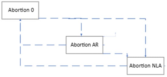 The previous model is extended to consider specific characteristics of abortions as presented by Keshavarzi et al. [16]. For this reason, a fourth dimension that represents the number of abortions (AB) a cow has suffered is added to the state variables. Values for AB range from zero to two, being zero for a cow that has never aborted, one for a cow that has suffered an RA, and two for a cow that has suffered an NLA. Thus, the extended model considers that each cow state is characterized by the coordinates of abortion, parity, pregnancy, and lactation (AB, PAR, PREG, MIL). The hierarchic digraph representing feasible transitions in the abortion dimension is shown in Figure 2, where three blocks are shown, each grouping the states with the same abortion value for a cow, and encapsulating the model represented by Figure 1. In particular, an abortion before 60 days of gestation (PREG ≤ 2 months) then it will not be considered as such, and therefore, the cow will remain at the same abortion type level. On the other hand, if gestation is over 60 days and less than 260 days (2 < PREG ≤ 9), cows are likely to experience an RA 1–1.9/12.5 ≈ 84.8% [16] moving to Block AB = 1, or an NLA with a probability of 1.9/12.5 ≈ 15.2% [16] going to Block AB = 2. Always, an abortion provokes a cow to move to PREG = 0, but if the abortion is RA, the cow is milking and progress to MIL + 1 within the same parity, while if the abortion is NLA the cow is not milking and so MIL = 1 and increase its parity by one (PAR + 1). Otherwise, when a cow is culled regardless of the AB-value, then the new cow starts in Block AB = 0 with state values of (0, 1, 0, 1). The unfeasible states will have the same PAR, PREG, and MIL values in each of the AB states from zero to two. In this way, the new transition matrix will have the dimensions of 10,800 rows and 10,800 columns.