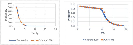 To validate the implementation of the base model, we are going to compare it with the steady-state results presented by Cabrera [10]. These results correspond to the replacement policy of slaughtering non-pregnant primiparous cows at MIL = 11 and slaughter multiparous cows at MIL = 10. The comparisons of herd distributions involve (i) the distribution of cows over MIL, (ii) the distribution of cows over PAR, and (iii) the joint distribution of MIL and PREG.