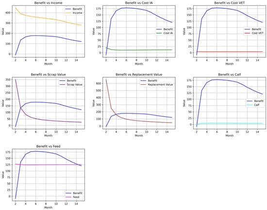 The results of the extended model that considers RA and NLA according to the new data parameters summarized in Table 2, show the impact on production and reproduction performance of abortions. In the first instance, we run the model performing the culling for non-pregnant cows (i.e., open cows) for different values of MIL and taking into account the impact of reduced milk production and increased probability of involuntary slaughtering of cows that have experienced abortion compared to those with normal calving, data. In this way, we obtain the benefit per animal per month for each of the MIL levels for open cows where voluntary culling is carried out, values presented in Table 7. We can see that the system reaches the maximum benefit of USD 178.77 when the policy of culling open cows that reach the sixth month of lactation failing to become pregnant in the case of primiparous cows. For comparison purposes, Table 7 also shows the result obtained with the base model that does not consider the characteristics of RA and NLA abortions (i.e., the animals are always kept in AB= 0 as shown in Figure 2) again following the Markovian decision model methodology, also obtaining the optimal benefit of USD 178.08 for open cows when they are culled at MIL = 6 for primiparous cows. The net benefit of each level of slaughter depends on the calculation of income minus costs, which is used to identify the optimum. The income, cost of artificial insemination, veterinary costs, waste value of the slaughtered cows is reviewed, replacement cost, income per calves born and the feeding costs of each level of voluntary culling and their results are presented in Figure 4.