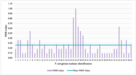 Distribution of the multiple antibiotic resistance (MAR) index of the P. aeruginosa isolates under study. The mean MAR value is represented by the blue line.