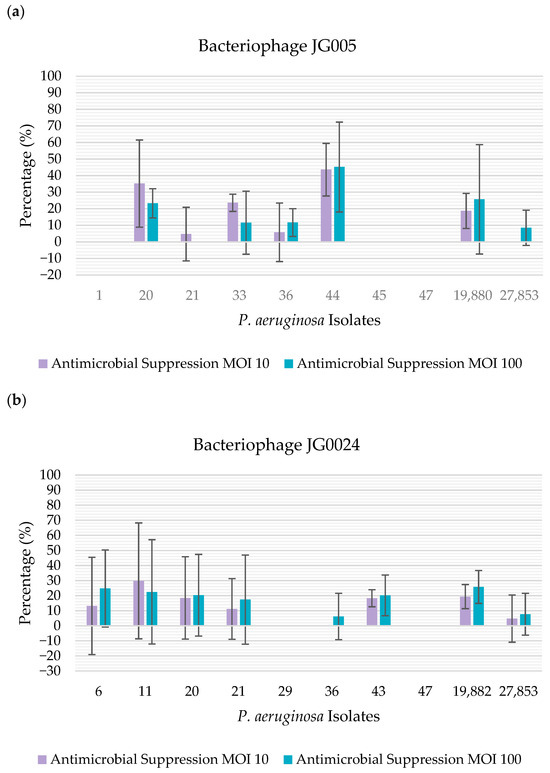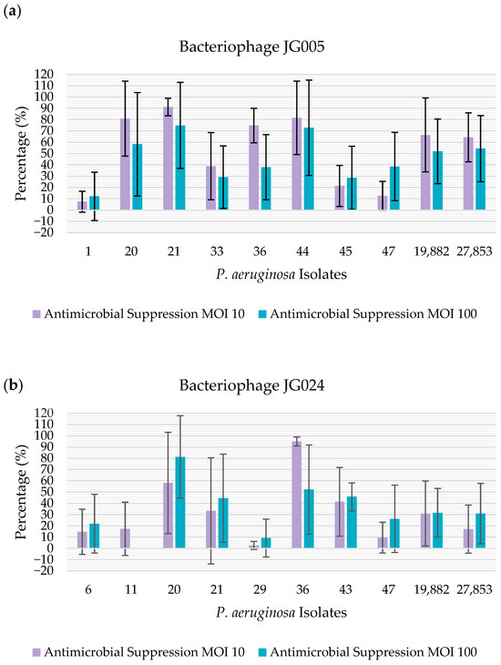 Percentage of antimicrobial suppression of the isolates by the bacteriophages, determined using crystal violet: (a) percentage of antimicrobial suppression of the isolates by bacteriophage JG005. The percentage of antimicrobial suppression is represented on the y-axis. The isolates tested are represented on the x-axis; (b) percentage of antimicrobial suppression of the presented isolates by bacteriophage JG024. The percentage of antimicrobial suppression is represented on the y-axis. The isolates tested are represented on the x-axis.