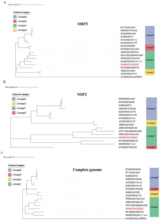 - Yim-Im, W.; Anderson, T.K.; Paploski, I.A.D.; VanderWaal, K.; Gauger, P.; Krueger, K.; Shi, M.; Main, R.; Zhang, J.; Chao, D.-Y. Refining PRRSV-2 genetic classification based on global ORF5 sequences and investigation of their geographic distributions and temporal changes. Microbiol. Spectr. 2023, 11, e0291623. [Google Scholar] [CrossRef] [PubMed]