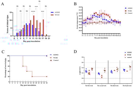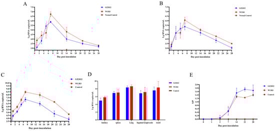 | Day | NADC30-Like Strain (GZ2022) | Highly Pathogenic Strain (WUH3) | PRRSV Classical Strain | ||||||
