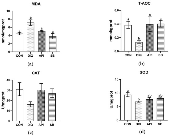 The effect of apigenin and sodium butyrate on antioxidative status activity in the jejunum of ducks induced by diquat. CON: ducks received basal diet accompanied by sterile saline injections; DIQ: ducks received basal diet accompanied by diquat injection; API: ducks received apigenin-supplemented basal diet with diquat challenge; SB: ducks received sodium butyrate-supplemented basal diet with diquat challenge. (a) Malondialdehyde (MDA) levels. (b) Total antioxidant capacity (T-AOC) levels. (c) Catalase (CAT) levels. (d) Superoxide dismutase (SOD) levels. Statistical significance assigned by letter groupings: a, b, (p < 0.05).