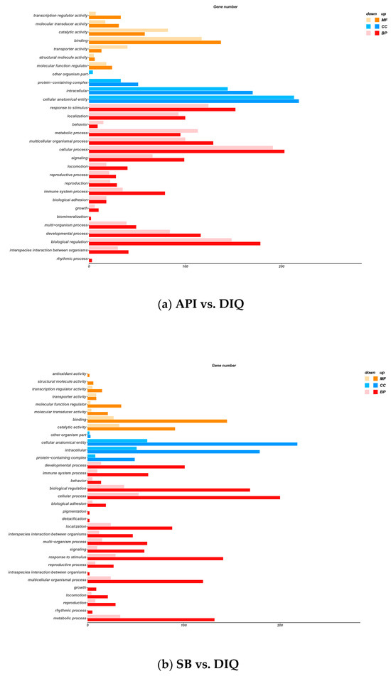 Gene ontology (GO) enrichment analysis. (a) GO enrichment analysis between the API and DIQ groups. (b) GO enrichment analysis between the SB and DIQ groups. The X-axis represents the significance enrichment number for genes, and the Y-axis represents the GO term.