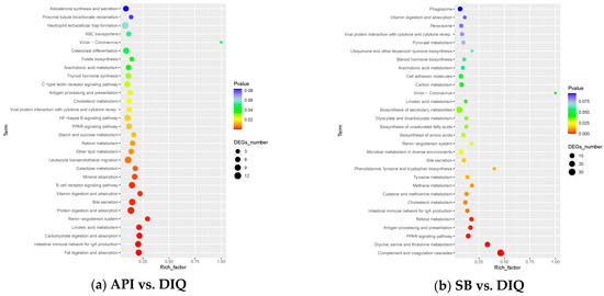 Kyoto Encyclopedia of Genes and Genomes (KEGG) enrichment analysis. (a) KEGG enrichment analysis between the API and DIQ groups. (b) KEGG enrichment analysis between the SB and DIQ groups.