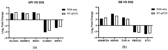 To validate the RNA-seq data fidelity, we randomly selected target genes (SLC4A3, ADAM12, BAG3, CLDN23, G6PC1, ADAMTS4, HSPA8, TLR1-A, FBXO32, and ST13) from the DIQ, API, and SB groups for qRT-PCR analysis. As shown in Figure 7, the qRT-PCR revealed expression patterns for these target genes that were consistent with those of the RNA-seq analysis, thus indicating the reliability of the RNA-seq data.
