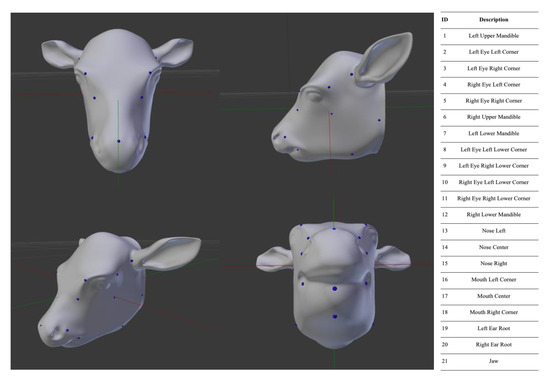To generate these pose annotations, we used the AFLW (Annotated Facial Landmarks in the Wild) tool [25], which is based on the Posit algorithm [26]. The Posit algorithm is a classical approach for estimating the 3D pose of an object from a single 2D image by leveraging known correspondences between 3D model points and their 2D projections. The AFLW tool operates through a C++ interface with an SQL database. The process to calculate the pose is as follows: (1) The process began by creating custom 3D models of the cow’s head and left ear using Blender. (2) Within Blender, we placed anatomical landmarks on each model and recorded their 3D coordinates. For the cow’s head, we positioned 21 landmarks at key locations, following the structure of the AFLW used for the human face. However, because of anatomical differences between the human face and the cow head, a perfect one-to-one mapping is not always possible. To address this, we mapped as many landmarks as possible based on anatomical similarity and spatial correspondence. For regions where a direct match was not possible, the closest functional or spatially analogous point on the cow head was selected (Table 2). Accordingly, the 21 landmarks defined on the cow head include the back and lower center of the mandible, four points around each eye (upper and lower, left and right), three points across the external nose (left, center, and right), the base of the ear attachment, three points along the mouth (left, center, and right), and the lowest point of the jaw (Figure 5).