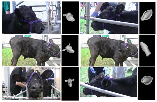 As technology advances and interest in animal welfare grows, non-invasive methods are increasingly being utilized in the field [1]. In particular, behavioral indicators are widely used to evaluate stress and pain in a variety of animal species [2,3,4] due to their non-invasive nature and practical applicability. For example, in dairy cattle, behavioral indicators such as altered posture, facial expressions, and changes in ear and head positions provide valuable insights into pain and stress levels [4]. Analyzing the pose of the head and ears plays a crucial role in animal behavior research, as these features help assess an animal’s emotional state, stress, and pain. For example, under stress, animals tend to use their left eye more frequently, and the head is often turned to the right, allowing the animal to monitor threats with the left eye. This behavior is linked to brain lateralization, where the right brain hemisphere—connected to the left eye—coordinates fight-or-flight responses [5]. In cattle studies, this tendency is observed when animals encounter unfamiliar people (a novel stimulus and potential threat) [6] or when forced to pass through narrow pathways [7], both situations in which they show a preference for using their left eye. The position of the ears is also an important indicator of stress or pain. In cattle and horses, ears that are directed forward indicate little or no pain, ears pulled back indicate a certain degree of pain, and ears hanging down, like those of a lamb, indicate a more severe pain state [4,8]. However, because the direction of the head and ears can change rapidly or shift in multiple directions over short periods, it is difficult to obtain reliable data through visual observation alone. Therefore, long-term monitoring and quantitative analysis are essential.