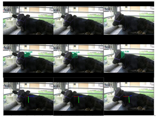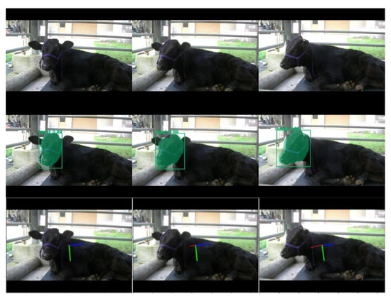 Sample results of head detection and pose estimation using the proposed method. The images illustrate a sequence of cattle head motion across multiple frames. In the second row, green bounding boxes and segmentation masks indicate the detected head regions. The third row displays the output of head pose estimation: a red line represents the direction the subject is facing (yaw), a green line indicates the downward direction (pitch), and a blue line corresponds to the sideways direction (roll).