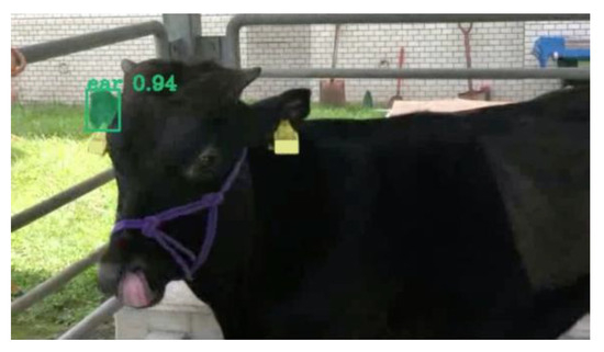 Example of Ear Detection Failure. The image shows how the AI system can mistake the left and right ears of cattle due to their similar appearance. Here, the right ear is detected (green box), but the similarity and position of both ears make it difficult for the system to distinguish between them.