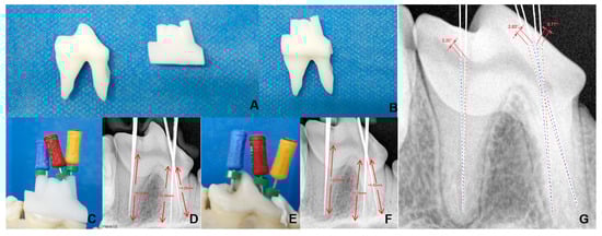Comparison of treatments by guided endodontics and conventional root canal methods. (A) The 3D-printed left fourth premolar tooth and its template. (B) Combination of 3D-printed root canal template and the printed tooth for verifying the fits. (C) Guided root canal treatment method. (D) Radiograph-based guided endodontics. (E) Removal of guided molding. (F) Radiograph-based conventional root canal method. (G) Comparison of root canal angles between the guided (blue line) and conventional (red line) root canal treatment methods.