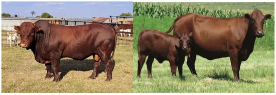 A Bonsmara bull (left) and a Bonsmara cow with a calf (right). (https://www.thecattlesite.com/breeds/beef/70/bonsmara/, accessed on: 16 February 2024) and (https://Bonsmara.co.za/journal/, accessed on: 16 February 2024).
