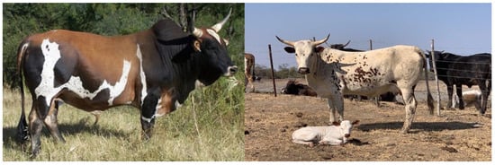Nguni bull (left) and cow with calf (right) (https://www.thecattlesite.com/breeds/beef/93/nguni, accessed on: 16 February 2024).