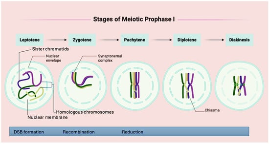 Prophase I is subdivided into five cytological stages, leptonema, zygonema, pachynema, diplonema, and diakinesis, each marked by distinct structural and molecular events that initiate, regulate, and complete recombination [21] (Figure 3). During the leptonema stage, chromosomes begin to condense into thin threads and attach to the nuclear envelope, forming chromatin loops from axial elements [22,23]. At this point, structural proteins such as REC8 and HORMAD1 start organising the chromosomal axes in preparation for homologous pairing. As meiosis progresses to the zygonema stage, homologous chromosomes initiate pairing and alignment. A programmed double-strand break (DSB), induced by the enzyme SPO11, marks the beginning of meiotic recombination [24]. Concurrently, a scaffold known as the synaptonemal complex (SC) begins to form between aligned chromosomes. This proteinaceous structure, composed of proteins such as SYCP1, SYCP2, and SYCP3, facilitates synapsis between homologs (Figure 3). The DSBs are processed by strand exchange proteins RAD51 and DMC1, which facilitate strand invasion and homologue recognition.