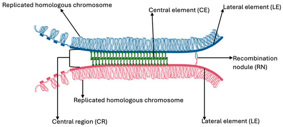 The alignment and synapsis of homologous chromosomes are regulated by the synaptonemal complex (SC), a tripartite proteinaceous structure consisting of two lateral elements (LEs) and a central region (CR). The LEs are composed of proteins SYCP2 and SYCP3, while the CR includes SYCP1, SYCE13, and TEX11, all of which coordinate chromosome pairing and synapsis [56,57] (Figure 4).