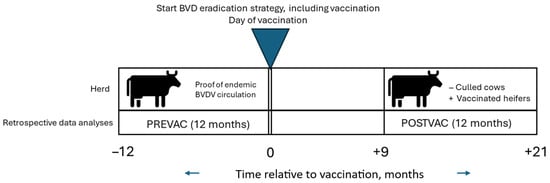 Retrospective data collection from selected herds before and after the start of the BVDV eradication strategy, including vaccination (BESIV). Herd performances were compared before and after vaccination. In herds, the initial non-vaccinated animals served as the control group for the subsequently vaccinated animals. Before vaccination (PREVAC), data were collected on the calves that were weaned during the 12 months before the day of vaccination (DV), along with data on their dams. After vaccination (POSTVAC), data were collected on the dams that calved from 9 months after the day of vaccination to 21 months after the day of vaccination. Those animals and their calves were followed up until weaning.
