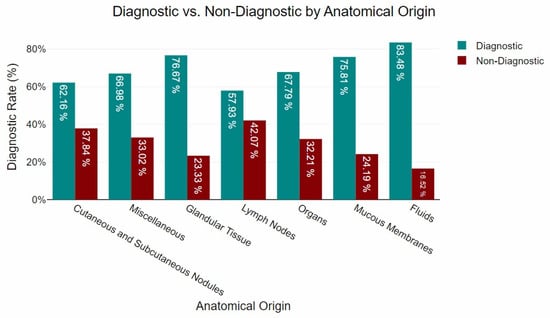 The present study revealed significant variations in diagnostic yield across anatomical groupings, reinforcing the influence of sample origin on cytological outcomes. Fluids exhibited the highest diagnostic success rate (83.48%), followed by glandular tissue (76.67%) and mucous membranes (75.81%). These findings align with previous research highlighting the superior cytological yield of fluid-based samples, which generally provide higher cellularity and well-preserved morphology, facilitating interpretation [,,]. Similarly, the high yield observed in mucous membranes and glandular tissue may be attributed to the relative homogeneity of their cellular composition, which enhances diagnostic accuracy [,,,]. Organs demonstrated a notable diagnostic success rate (67.79%), consistent with previous reports, despite the inherent challenges in obtaining representative samples from these tissues [,,]. Conversely, lower rates were observed in miscellaneous (66.98%), cutaneous and subcutaneous nodules (62.16%), and lymph nodes (57.93%). These findings corroborate previous studies [,,], suggesting that cutaneous and subcutaneous samples, despite being more accessible, are prone to artefacts such as haemodilution, poor cellular preservation, and inflammatory contamination, which can reduce diagnostic accuracy. The diagnostic performance of FNA cytology in lymph node evaluation underscores the challenges associated with differentiating reactive hyperplasia from neoplastic infiltration, as previously documented [,,]. While cytology remains a valuable tool for preliminary assessment, histopathological confirmation is often required for definitive classification, particularly in cases with ambiguous cytological features [].
