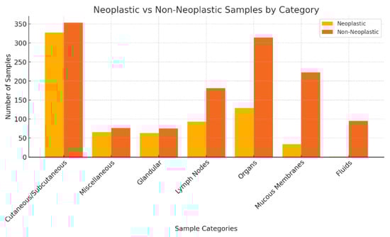 In the analysis, cutaneous and subcutaneous nodules constituted the primary category, encompassing 680 samples, of which 48.09% (n = 327) were characterised as neoplastic and 51.91% (n = 353) as non-neoplastic. The second largest category, consisting of 142 miscellaneous samples, exhibited a neoplastic incidence of 46.48% (n = 66) versus 53.52% (n = 77) of non-neoplastic. Glandular tissue, contributing 138 samples, displayed a neoplastic lesion rate of 45.65% (n = 63) against 54.35% (n = 75) non-neoplastic. Lymph nodes, with 274 samples assessed, showed a lower neoplastic proportion at 33.94% (n = 93) versus non-neoplastic (n = 181; 66.6%). Organ samples, which totalled 444, had a neoplastic lesion proportion of 29.28% and a non-neoplastic proportion of 70.72% (n = 314). Mucous membranes, accounting for 257 samples, primarily consisted of non-neoplastic lesions, with a significantly lower rate of 13.23% and 86.77% (n = 223) non-neoplastic. Fluid samples, the smallest group in this study with 96 specimens, demonstrated the lowest incidence of neoplastic conditions, at just 1.04% and 98.96% (n = 95) non-neoplastic.