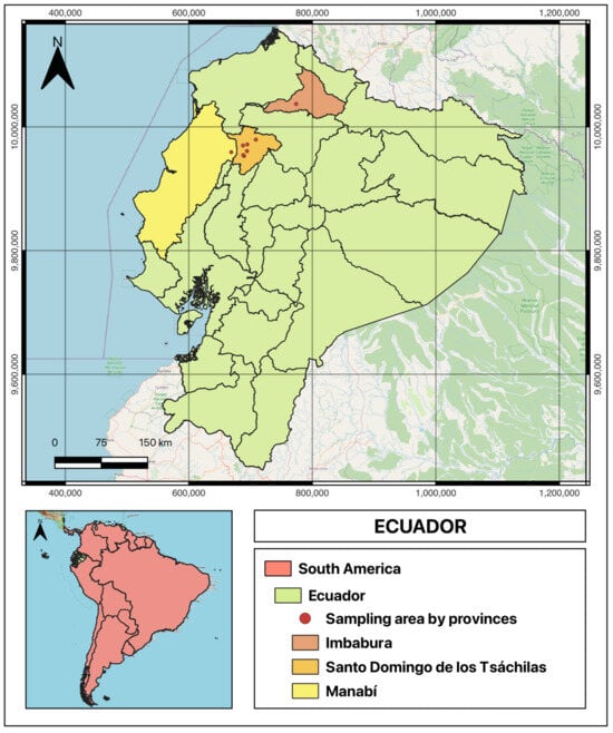 Geographic location of sampled farms in Ecuador. The map highlights Ecuador within South America and shows the provinces of Santo Domingo de los Tsáchilas, Manabí, and Imbabura. Sampled farm locations are indicated. The map was created using QGIS (version 3.42).