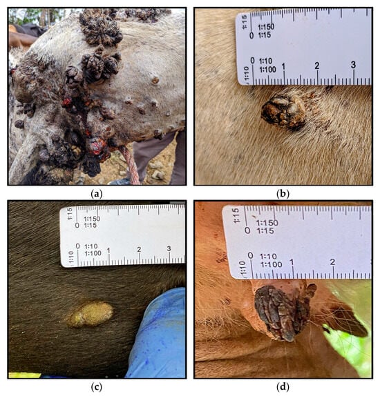 In this study, bovine warty skin lesions were collected from farms around Santo Domingo de los Tsáchilas Province in Ecuador. Lesions suggestive of papillomatosis were sampled from various anatomical locations in affected cattle, with multiple lesions sometimes taken from the same animal. The most common morphology observed was the cauliflower-like structure (35.1%), consistent with previous reports describing pedunculated, dry, and warty appearances in cattle [2,8]. The absence of BPV DNA in eight samples may be attributed to factors such as low viral load, DNA degradation, or the presence of other skin conditions that mimic papillomatosis. As no histological analysis was performed to confirm tissue composition, we cannot exclude the possibility that these lesions were non-papillomatous.