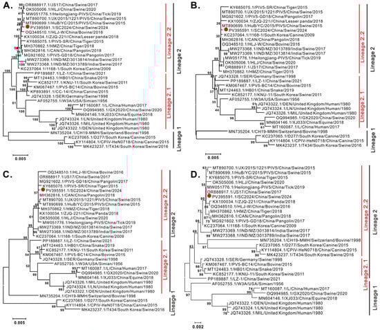 To elucidate the genetic relationships between PIV5 SC2024 and the reference strains, phylogenetic trees were constructed using the neighbor joining method via MEGA 7.0 software, based on the NP, F, and HN genes, and complete genomic sequences. As shown in Figure 2, all phylogenetic trees revealed that PIV5 strains divided into two distinct lineages (Lineage 1 and Lineage 2), with lineage 2 further diverging into two sub-lineages (Lineage 2.1 and Lineage 2.2). Significantly, strain SC2024 clustered within the tertiary sub-lineage 2.2 alongside most Chinese swine-derived strains, which also included strains isolated from pangolins, tigers, lesser pandas, and ticks.