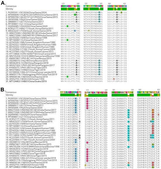 The glycoproteins F and HN, which are critical importance for viral attachment, membrane fusion, and host cell entry, were subjected to further analysis. As shown in Figure 3A, compared with the reference strains, the F protein of SC2024 harbored a novel amino acid mutation (D448G). Notably, three amino acid sites (A279, R339, A445) in the F protein were conserved across SC2024 and strains HLJ-W, CAN, PIV5-GD18, PIV5-SR, HMZ, ZJQ-221, and Heilongjiang-PIV5, which originated from diverse hosts. Correspondingly, four amino acid positions (K139, L210, T288, S447) in the HN protein of SC2024 showed complete amino acid identity with those in strains CAN, PIV5-GD18, PIV5-SR, HMZ, ZJQ-221, and Heilongjiang-PIV5 (Figure 3B). These findings suggest that the F and HN proteins may serve as key determinants in PIV5 cross-species transmission.