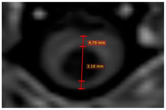 Additionally, owners were asked to return to the same clinic for follow-up examinations to minimise variability related to MRI equipment. For positioning, the dog’s head and neck were extended so that the skull base aligned approximately with the floor of the vertebral canal at C1 and C2, as described previously [2]. MRI examination dates and intervals between scans were recorded. When more than three scans were available, only the first and last scans were evaluated. The first and second MRI are referred to as MRI1 and MRI2, respectively. For both scans, each dog was assessed for CM/SM classification, and quantitative measurements of SM were performed. The presence of CM was determined using sagittal images, while SM was evaluated using both sagittal and transverse images. CM was classified according to the grading system described in previous studies [2,17].