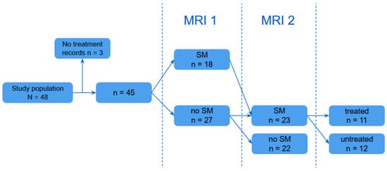 Eleven dogs with SM received furosemide treatment between MRI1 and MRI2, with dosages ranging from 1.04–2.86 mg/kg. In one case, the dosage was increased from 0.6 mg/kg to 1.21 mg/kg between the scans. Dogs classified with SM at either MRI1 and/or MRI2 were subsequently grouped according to furosemide treatment (treated vs. untreated) (Figure 2). The proportion of dogs classified as “progressed” and the changes in MSD and MSD/SCD-r between MRI1 and MRI2 were then compared between these groups. No significant differences were identified between the groups in terms of age, scan interval, weight or sex at either MRI time point. Table 6 summarises the proportion of progressed dogs and mean differences in MSD and MSD/SCD-r between MRI1 and MRI2 for treated versus untreated dogs. The change in MSD between MRI1 and MRI2 was significantly smaller in dogs treated with furosemide compared to those not treated (p = 0.030; CI: 0.10–1.74). However, the changes in MSD/SCD-r (p = 0.159; CI: −4.30–24.63%) and the proportion of progressed dogs (p = 0.069; CI OR: 0.00–1.43) did not differ significantly between the groups. Of the six dogs classified as “partially recovered”, four had received furosemide treatment, one had not, and one lacked treatment records.