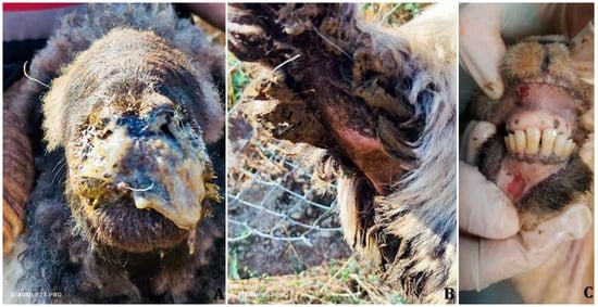 Figure 3E). The dead sheep in flock 2 presented gingival ulcerations, tracheal hemorrhages, and bronchopneumonia localized to the apical lobes. Edema and congestion were observed in the diaphragmatic lung lobes, along with ascites (