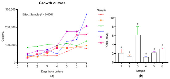 Proliferative capacity of equine colostrum-derived MSCs, evaluated through semi-logarithmic growth curves (a) and population doubling time (PDT) analysis (b). Data are presented as mean (a) and as mean ± SD (b). Statistical analysis: One-way ANOVA with Tukey’s post-hoc test (b). Different letters indicate significant differences (p < 0.05) among samples.