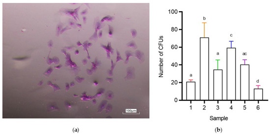 Colony-forming unit (CFU) assay of colostrum-derived MSCs. (a) Representative image of dispersed CFUs after Giemsa staining. Magnification: 100×. (b) Average number of CFUs per sample. Data are expressed as mean ± SD. Statistical analysis: One-way ANOVA with Tukey’s post-hoc test. Different letters indicate significant differences (p < 0.05) among samples.