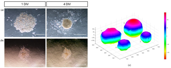 Adhesion assay of colostrum-derived MSCs. Representative bright-field images showing spheroid-forming (a) and non-forming (b) colostrum-derived MSCs after 1 to 4 days of hanging drop culture (5000 cells/25 µL drop). Magnification: 100×. DIV, day in vitro. 3D spheroid volume reconstruction was performed using ReViSP software (sourceforge.net/projects/revisp/, v. 2.3) (c), starting from the acquired 2D bright-field images. Measure unit: pixel.