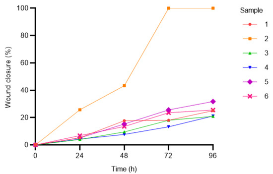The quantitative analysis revealed significant differences in wound closure percentages among the groups (two-way ANOVA, p < 0.05). Notably, sample 2 demonstrated the highest migratory capacity, achieving complete wound closure (100%) at 72 h, significantly outperforming all other groups. In contrast, samples 1, 3, 4, and 6 exhibited a more gradual increase in wound closure over time, without exceeding approximately 30% at 96 h (Figure 5).